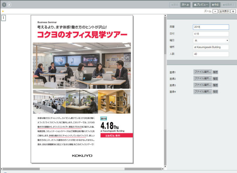 オンデマンドMPMをスタートさせ、デザイン会社がデザインしたDMをキンコーズがテンプレート化を行い、展開に応じて日時や会場マップの差し替え等、可変箇所の更新を営業推進グループの内田さんが担当している。