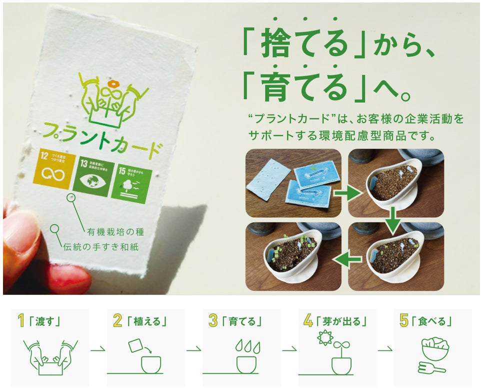 「プラントカード」は、有機農法で育てたハーブの種を日本伝統の手すき和紙に織り込んだものに、メッセージなどをプリントするサービスです。メッセージカードとして使った後に、廃棄するのではなく、土に還すことで、ハーブが発芽し成長します。 捨てずに育てる活動として環境にやさしく、また伝統の手すき和紙職人の雇用を守り、技術継承にも貢献する商品です。