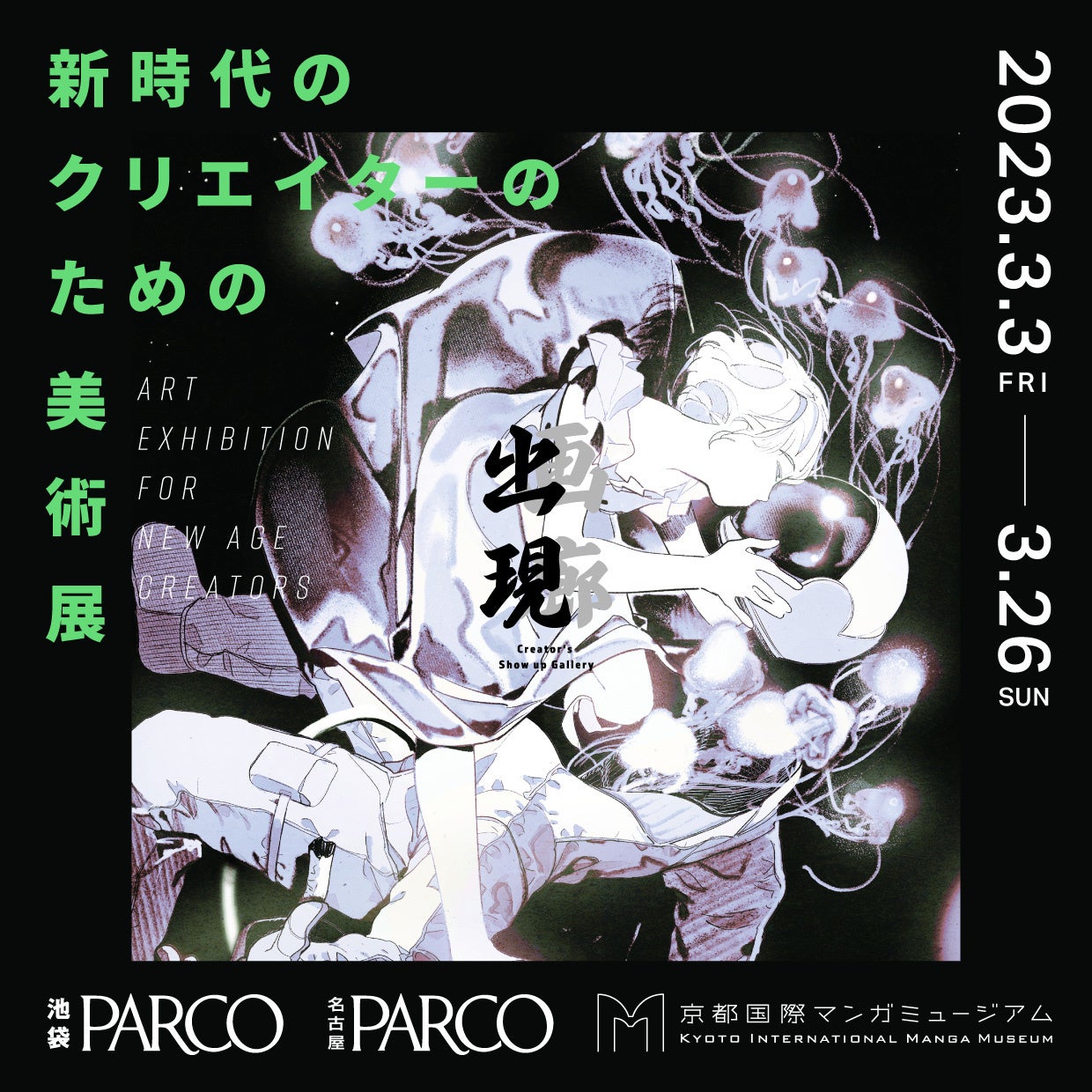 「出現画廊」は、中京テレビ株式会社が主催するデジタルアート美術展のプロジェクトです。2022年1月にスタートし今年3回目が開催されました。 当社はプロジェクトテーマである「新時代のクリエイターを発掘し、活躍の場を創出することができないか?」という思いに共感し、第一回目から協賛企業として過去に展示スペースの提供などで参加しています。 今回のイベントにおいては、総勢500名以上のクリエイターが参加したイラストレーションアワード「出現画会」に『キンコーズ賞』を設け、副賞としてツクルでの個展開催とグッズ販売が行える権利を授与しました。