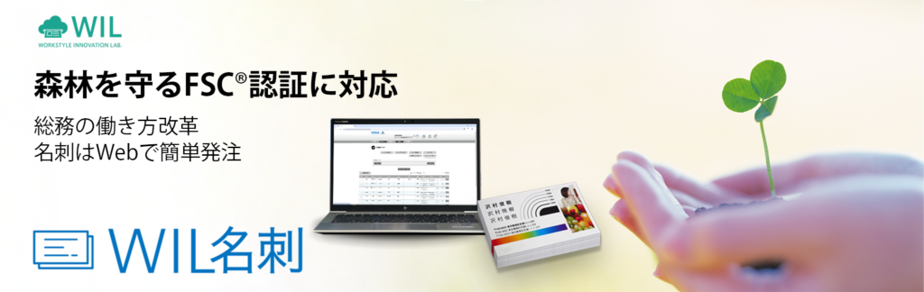 「WIL 名刺発注システム」は、名刺の発注を所属する支社や営業所ごとに取りまとめ、台帳管理や発注業務を分散・簡略化するサービスで、これにより名刺管理を行う部署の働き方改革を支援し、利用者にも短納期で名刺が納品されるというメリットがあります。このサービスの用紙ラインアップにFSC®認証用紙を加えました。