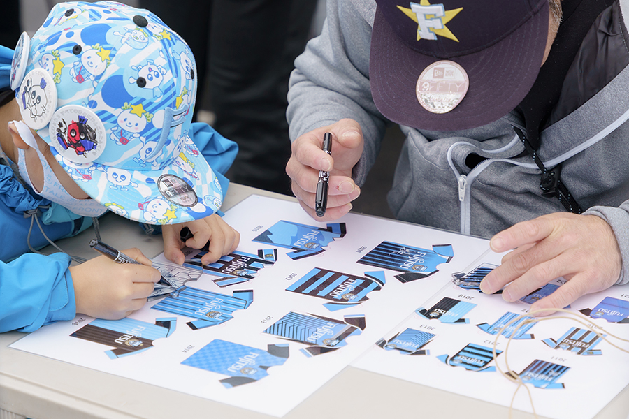 本企画では、2024年に川崎市制100周年を記念して掲出されたターポリン製バナーを破棄せず、ファン参加型のワークショップで”ボンフィン(リボン型チャーム)”として再生します。参加者は、チームロゴやキャラクターが印刷されたボンフィンに、自身の好みの色や柄を自由に加え、世界にひとつだけの応援アイテムを制作できます。裏面には当時の100周年事業で使用されていたデザインがそのまま残されており、カット位置によってすべて異なる表情を持つ“一点物”として楽しめることも大きな魅力です。