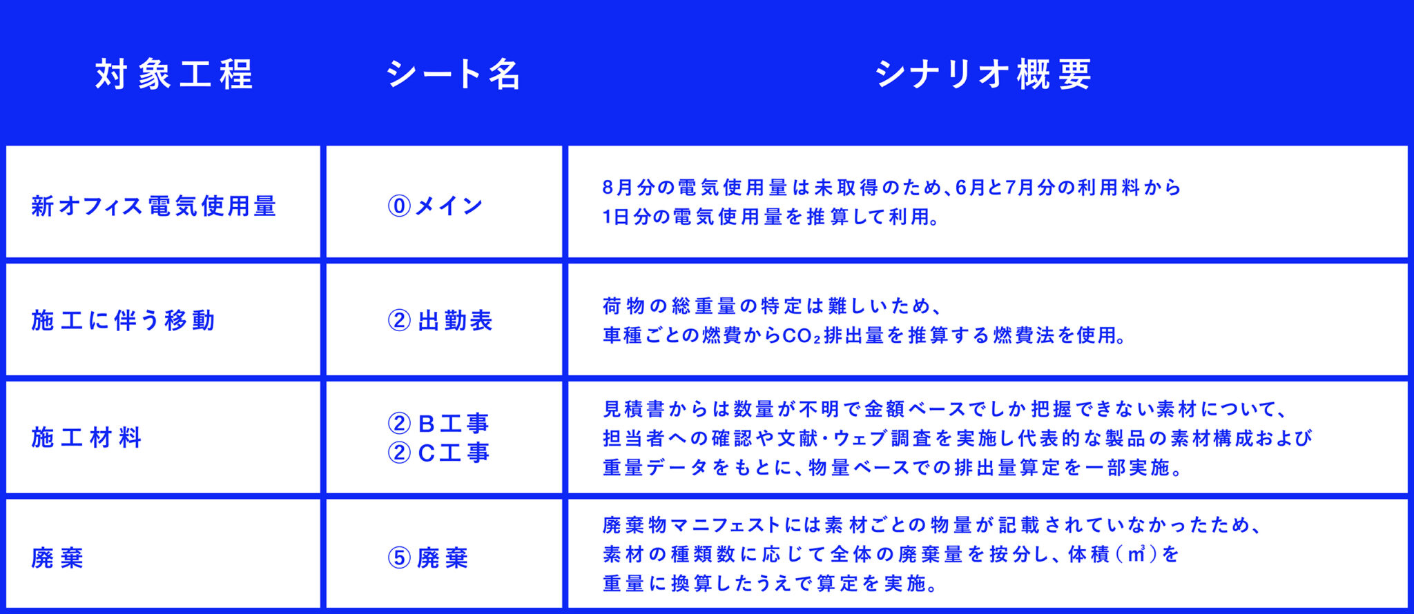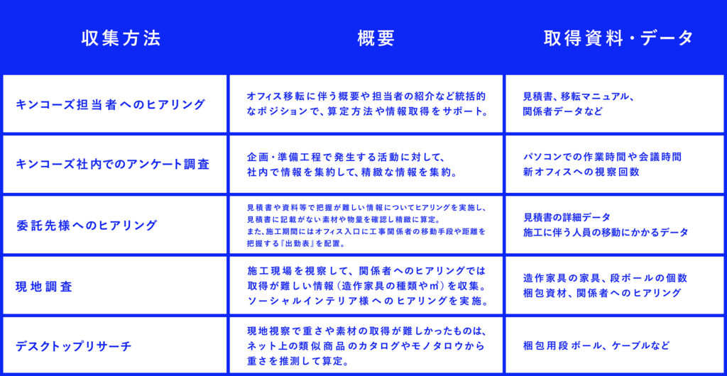 例えば、移転準備に伴うパソコン作業や会議時間まで、感覚的な推測ではなく、活動量を都度収集・記録。これにより、より現実に近い排出量を算出しました。また、作業を担っていただいた業者様にも直接ヒアリングを行い、「見積書ベース」ではなく「物量ベース」での算定を実現。施工や輸送など工程が多岐にわたる部分についても、輸送管理シートや出勤表を活用。電話での聞き取りを通じて、実査に近い信頼性の高いデータ収集を実現しています。