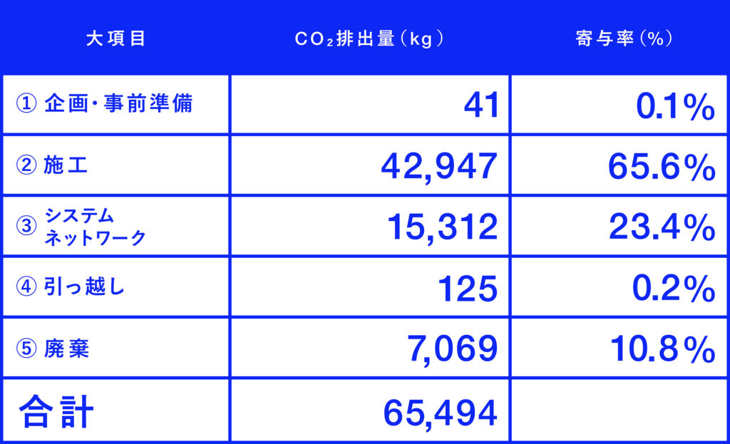 施工工程が最も多く 65.6%(42,947kgCO₂) を占め、次いでシステム/ネットワーク工事が 23.4%(15,312kgCO₂)、廃棄工程が 10.8%(7,069kgCO₂) でした。