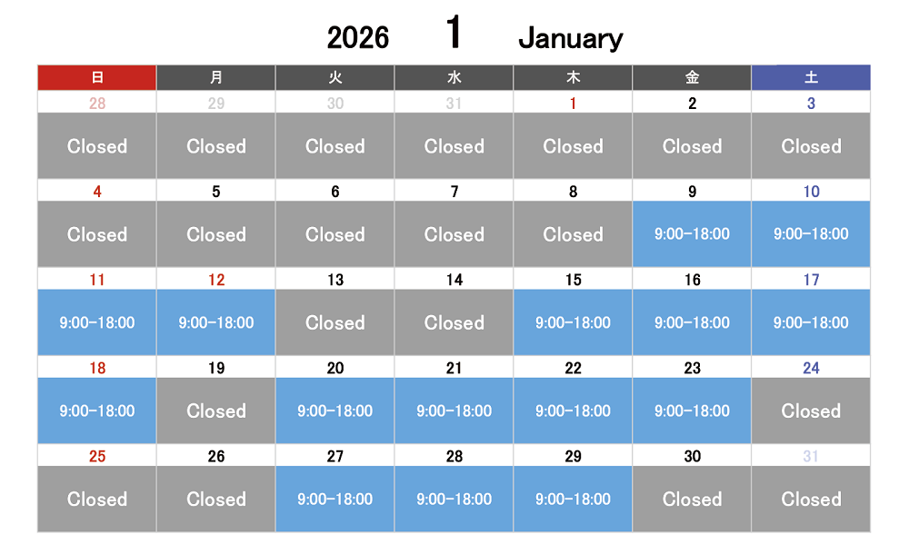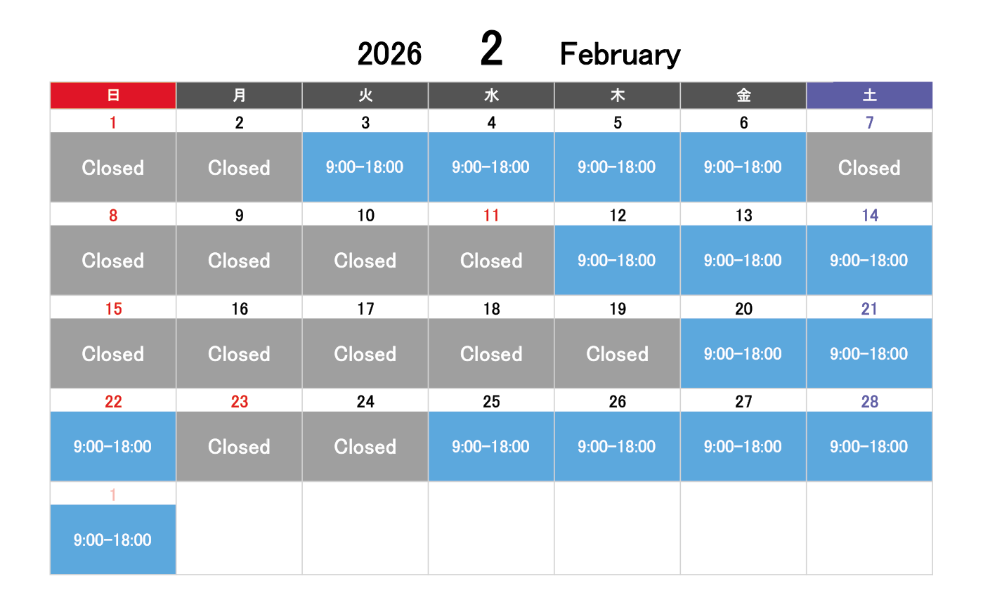 ※イベント開催の都合により、月ごとに営業日や営業時間が異なります。ご来店の際は下記の営業日カレンダーをご確認ください。